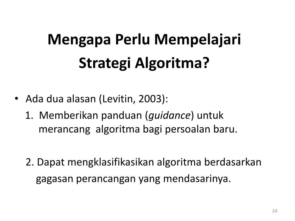 MengapaPerluMempelajari StrategiAlgoritma? • Adaduaalasan (Levitin, 2003): 1. Memberikanpanduan (guidance) untukmerancangalgoritmabagipersoalanbaru. 2. Dapatmengklasifikasikanalgoritmaberdasarkan gagasanperancangan yang mendasarinya.
