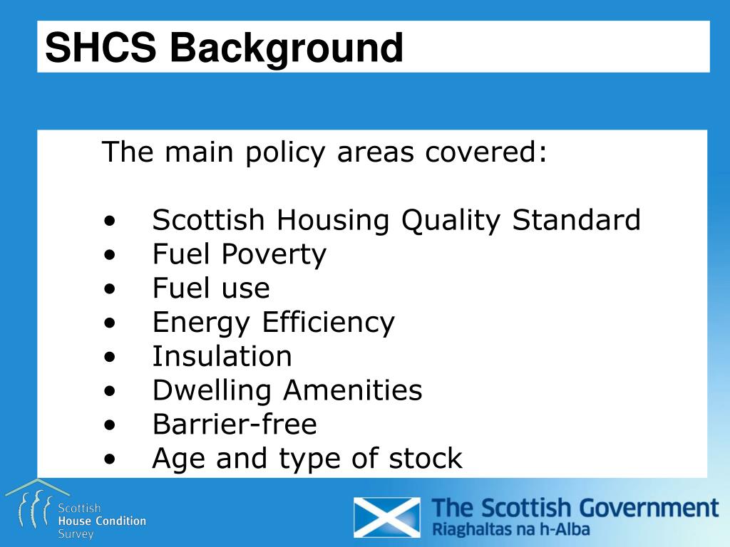 SHCS Background • The main policy areas covered: • Scottish Housing Quality Standard • Fuel Poverty • Fuel use • Energy Efficiency • Insulation • Dwelling Amenities • Barrier-free • Age and type of stock