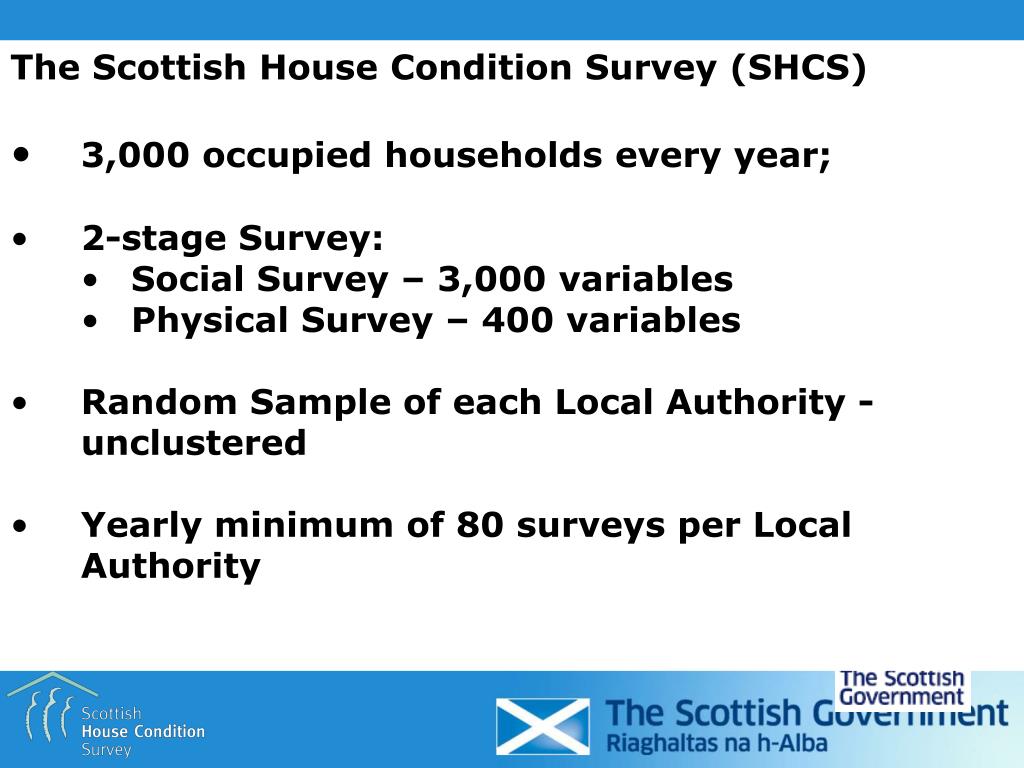 The Scottish House Condition Survey (SHCS) • 3,000 occupied households every year; • 2-stage Survey: • Social Survey – 3,000 variables • Physical Survey – 400 variables • Random Sample of each Local Authority - unclustered • Yearly minimum of 80 surveys per Local Authority