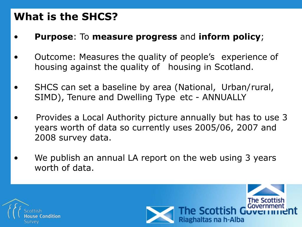 What is the SHCS? • Purpose: To measure progress and inform policy; • Outcome: Measures the quality of people’s experience of housing against the quality of housing in Scotland. • SHCS can set a baseline by area (National, Urban/ rural, SIMD), Tenure and Dwelling Type etc - ANNUALLY • Provides a Local Authority picture annually but has to use 3 years worth of data so currently uses 2005/06, 2007 and 2008 survey data. • We publish an annual LA report on the web using 3 years worth of data.
