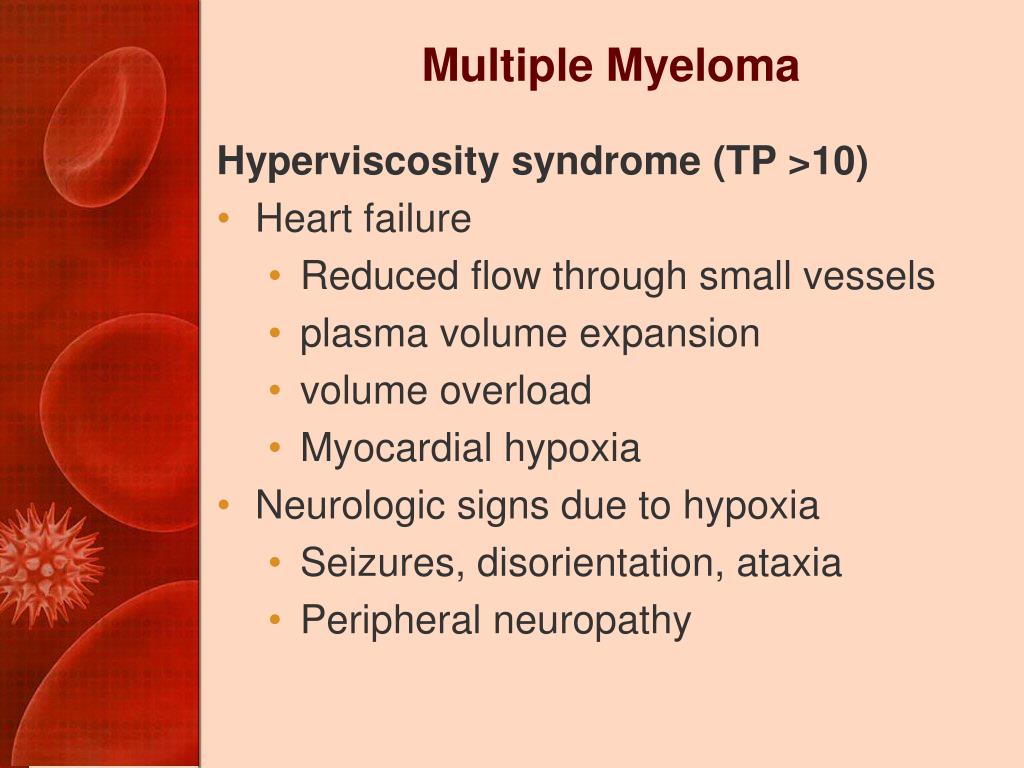 Multiple Myeloma Hyperviscosity syndrome (TP >10) • Heart failure • Reduced flow through small vessels • plasma volume expansion • volume overload • Myocardial hypoxia • Neurologic signs due to hypoxia • Seizures, disorientation, ataxia • Peripheral neuropathy