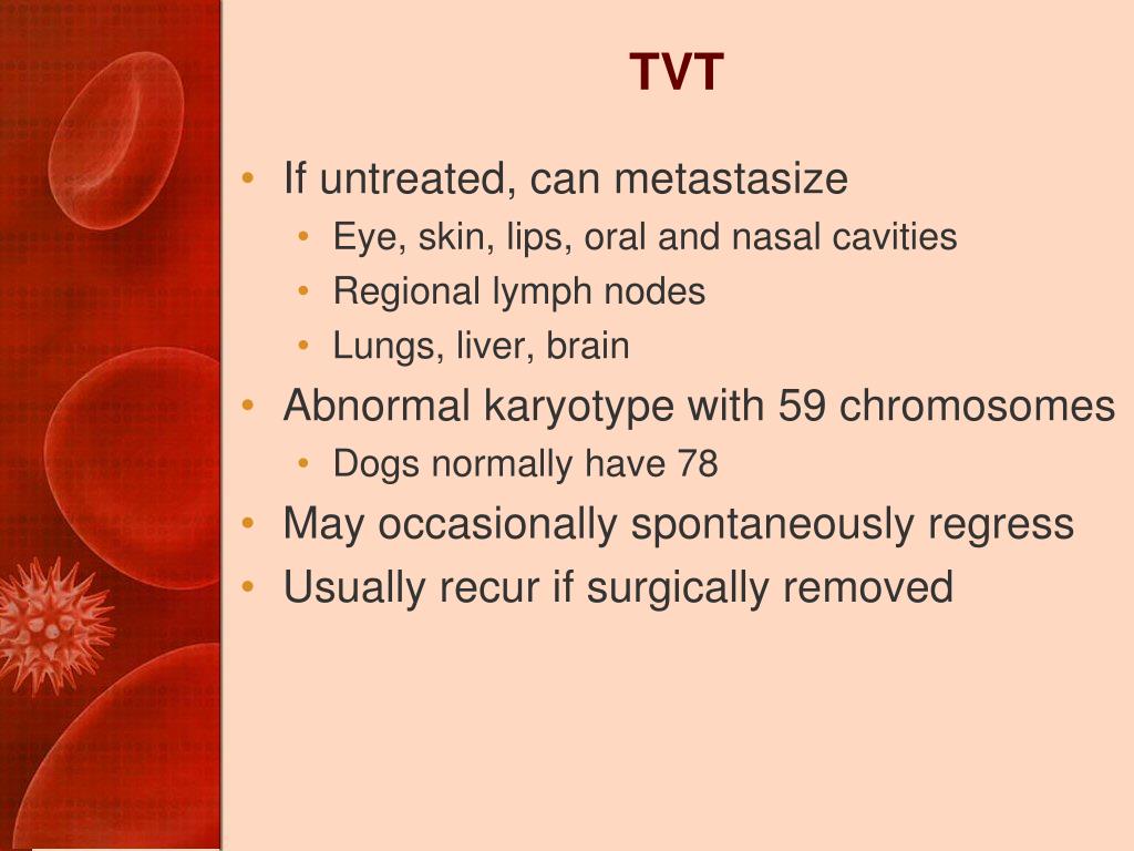 TVT • If untreated, can metastasize • Eye, skin, lips, oral and nasal cavities • Regional lymph nodes • Lungs, liver, brain • Abnormal karyotype with 59 chromosomes • Dogs normally have 78 • May occasionally spontaneously regress • Usually recur if surgically removed