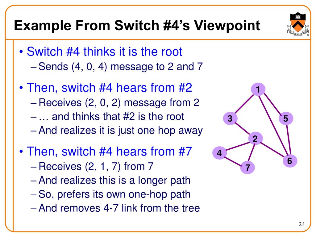 Example From Switch #4’s Viewpoint • Switch #4 thinks it is the root • Sends (4, 0, 4) message to 2 and 7 • Then, switch #4 hears from #2 • Receives (2, 0, 2) message from 2 • … and thinks that #2 is the root • And realizes it is just one hop away • Then, switch #4 hears from #7 • Receives (2, 1, 7) from 7 • And realizes this is a longer path • So, prefers its own one-hop path • And removes 4-7 link from the tree 1 3 5 2 4 6 7