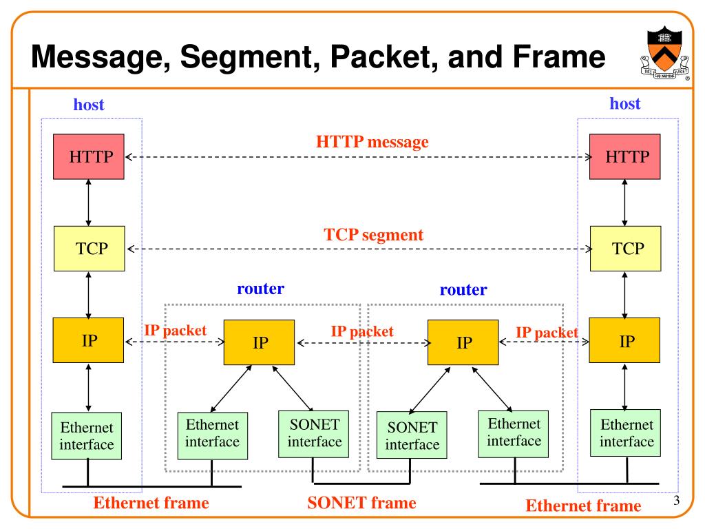 IP IP IP Ethernet interface Message, Segment, Packet, and Frame host host HTTPmessage HTTP HTTP TCP segment TCP TCP router router IP packet IP packet IPpacket IP Ethernet interface SONET interface Ethernet interface Ethernet interface SONET interface Ethernetframe SONET frame Ethernet frame
