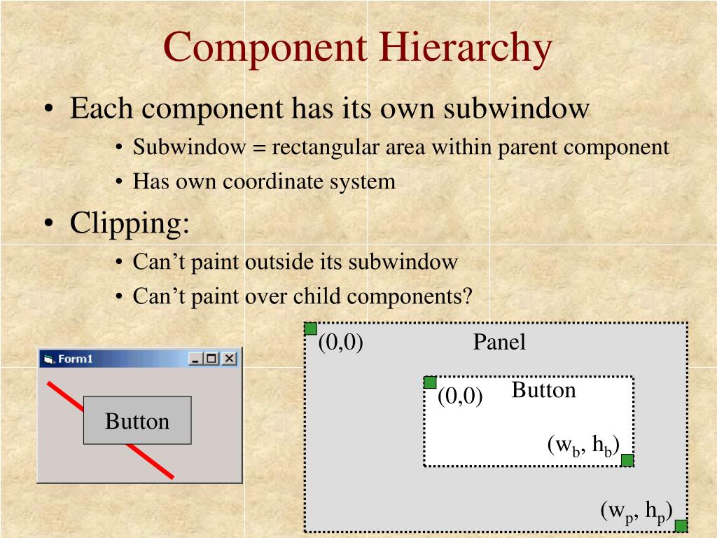 Component Hierarchy • Each component has its own subwindow • Subwindow = rectangular area within parent component • Has own coordinate system • Clipping: • Can’t paint outside its subwindow • Can’t paint over child components? (0,0) Panel Button (0,0) Button (wb, hb) (wp, hp)