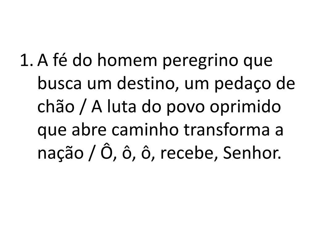 A fé do homem peregrino que busca um destino, um pedaço de chão / A luta do povo oprimido que abre caminho transforma a nação / Ô, ô, ô, recebe, Senhor.