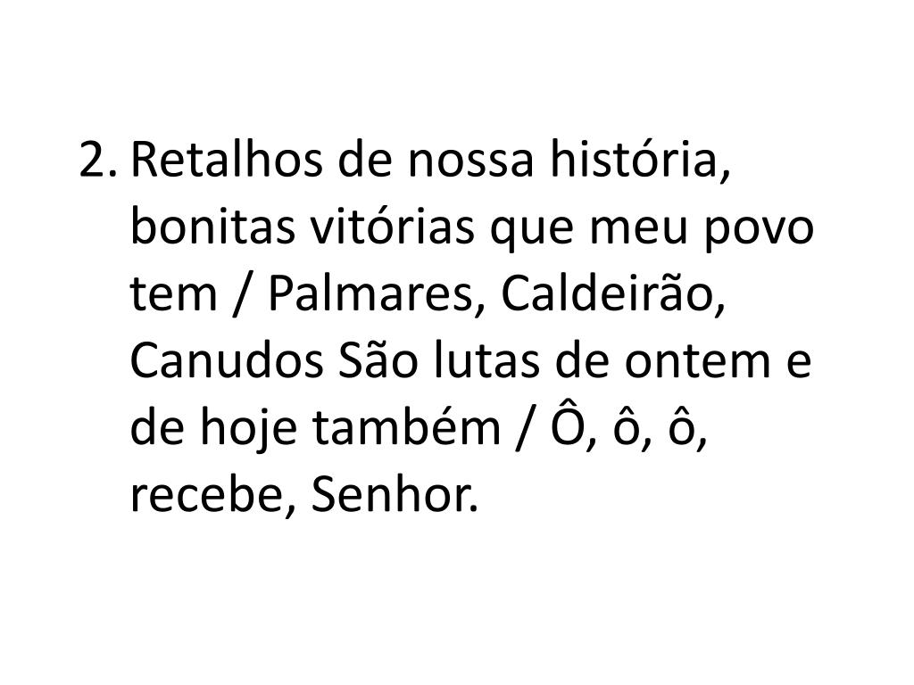 Retalhos de nossa história, bonitas vitórias que meu povo tem / Palmares, Caldeirão, Canudos São lutas de ontem e de hoje também / Ô, ô, ô, recebe, Senhor.