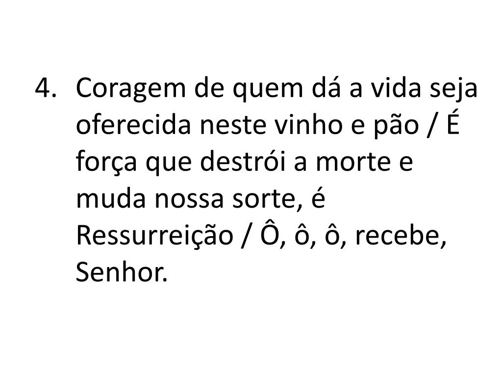 Coragem de quem dá a vida seja oferecida neste vinho e pão / É força que destrói a morte e muda nossa sorte, é Ressurreição / Ô, ô, ô, recebe, Senhor.