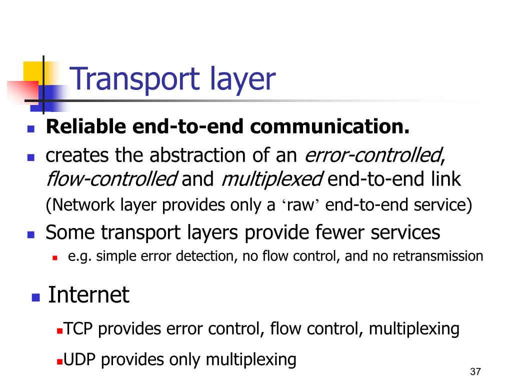 Transport layer • Reliable end-to-end communication. • creates the abstraction of an error-controlled, flow-controlled and multiplexed end-to-end link (Network layer provides only a ‘raw’ end-to-end service) • Some transport layers provide fewer services • e.g. simple error detection, no flow control, and no retransmission • Internet • TCP provides error control, flow control, multiplexing • UDP provides only multiplexing