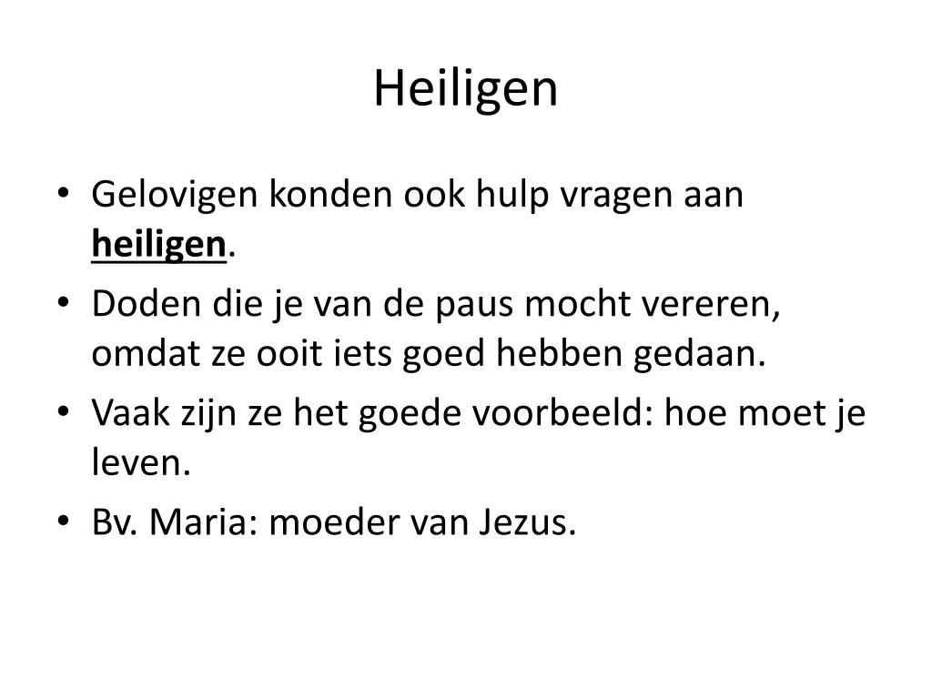 Heiligen • Gelovigen konden ook hulp vragen aan heiligen. • Doden die je van de paus mocht vereren, omdat ze ooit iets goed hebben gedaan. • Vaak zijn ze het goede voorbeeld: hoe moet je leven. • Bv. Maria: moeder van Jezus.