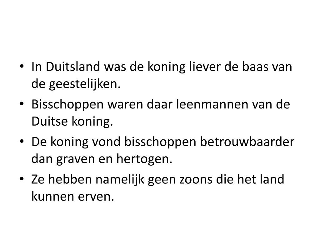 In Duitsland was de koning liever de baas van de geestelijken. • Bisschoppen waren daar leenmannen van de Duitse koning. • De koning vond bisschoppen betrouwbaarder dan graven en hertogen. • Ze hebben namelijk geen zoons die het land kunnen erven.