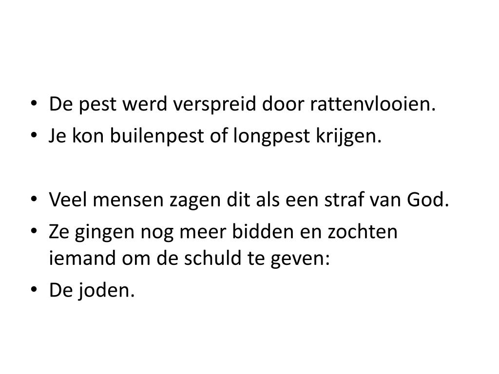 De pest werd verspreid door rattenvlooien. • Je kon builenpest of longpest krijgen. • Veel mensen zagen dit als een straf van God. • Ze gingen nog meer bidden en zochten iemand om de schuld te geven: • De joden.