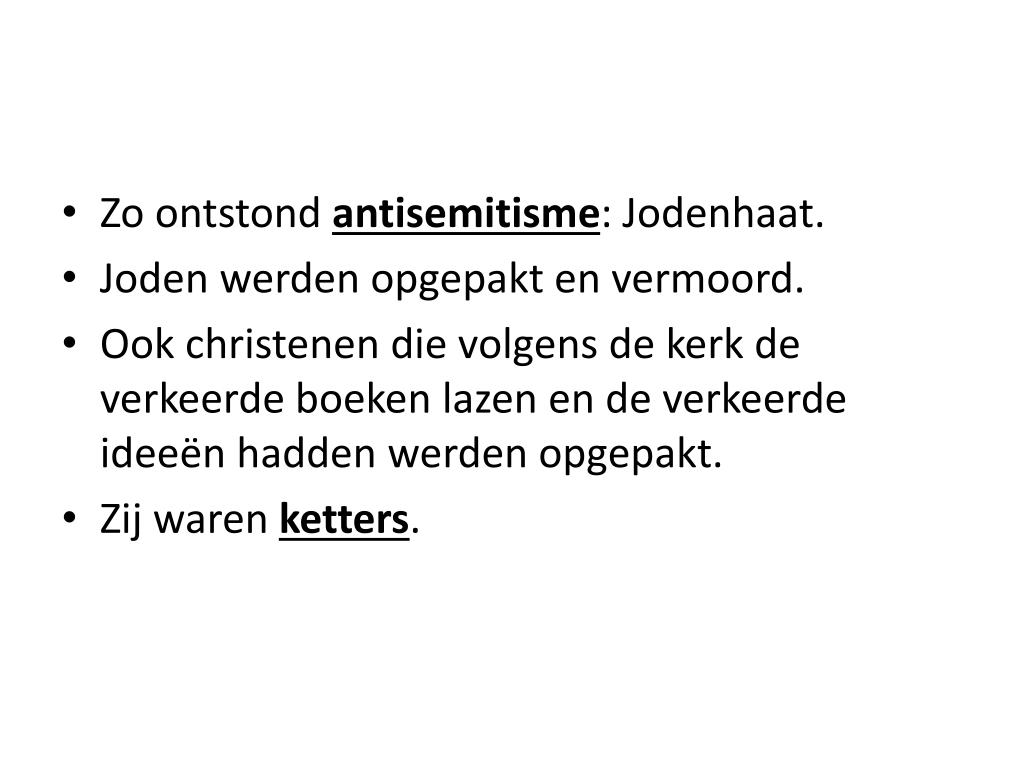 Zo ontstond antisemitisme: Jodenhaat. • Joden werden opgepakt en vermoord. • Ook christenen die volgens de kerk de verkeerde boeken lazen en de verkeerde ideeën hadden werden opgepakt. • Zij waren ketters.