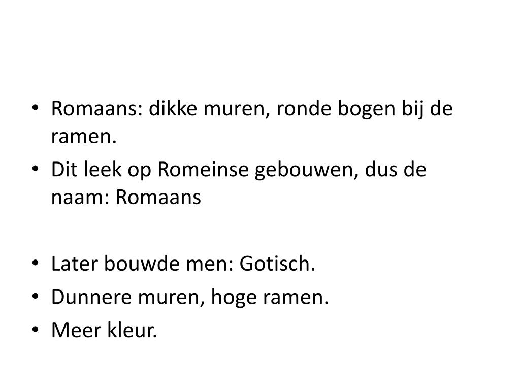 Romaans: dikke muren, ronde bogen bij de ramen. • Dit leek op Romeinse gebouwen, dus de naam: Romaans • Later bouwde men: Gotisch. • Dunnere muren, hoge ramen. • Meer kleur.