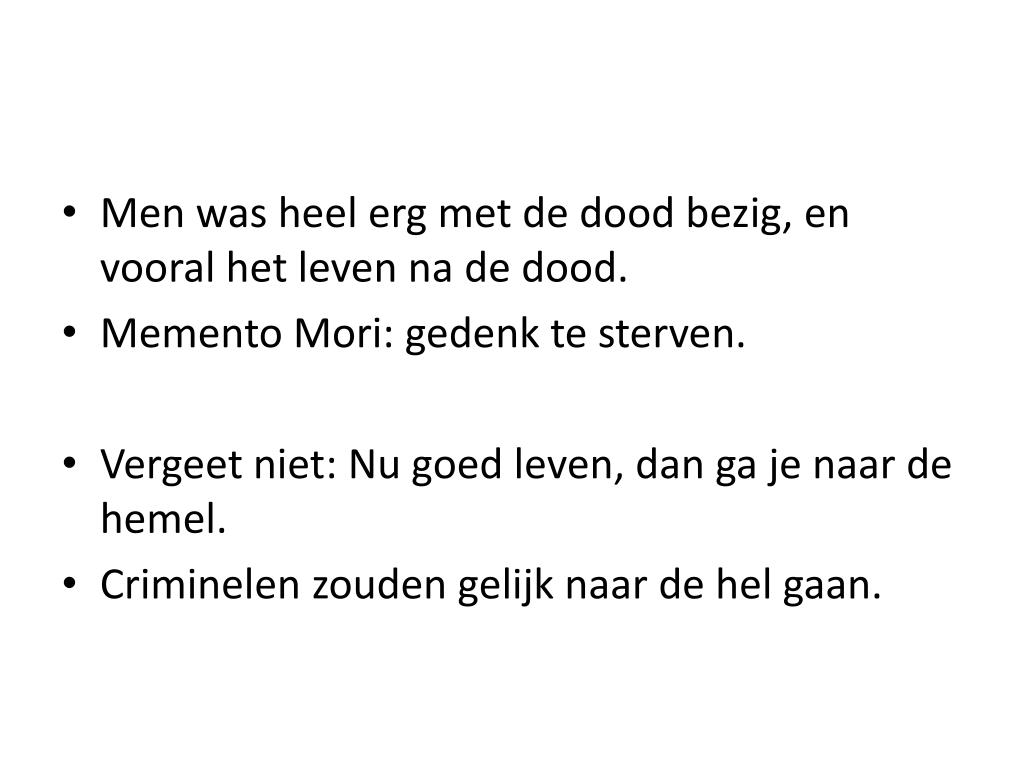 Men was heel erg met de dood bezig, en vooral het leven na de dood. • Memento Mori: gedenk te sterven. • Vergeet niet: Nu goed leven, dan ga je naar de hemel. • Criminelen zouden gelijk naar de hel gaan.