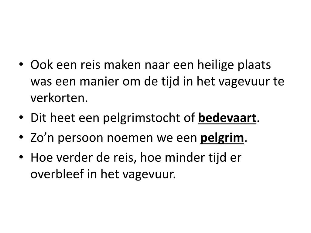 Ook een reis maken naar een heilige plaats was een manier om de tijd in het vagevuur te verkorten. • Dit heet een pelgrimstocht of bedevaart. • Zo’n persoon noemen we een pelgrim. • Hoe verder de reis, hoe minder tijd er overbleef in het vagevuur.