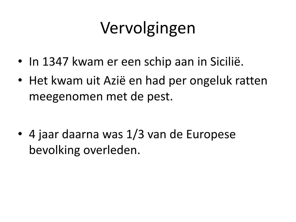 Vervolgingen • In 1347 kwam er een schip aan in Sicilië. • Het kwam uit Azië en had per ongeluk ratten meegenomen met de pest. • 4 jaar daarna was 1/3 van de Europese bevolking overleden.