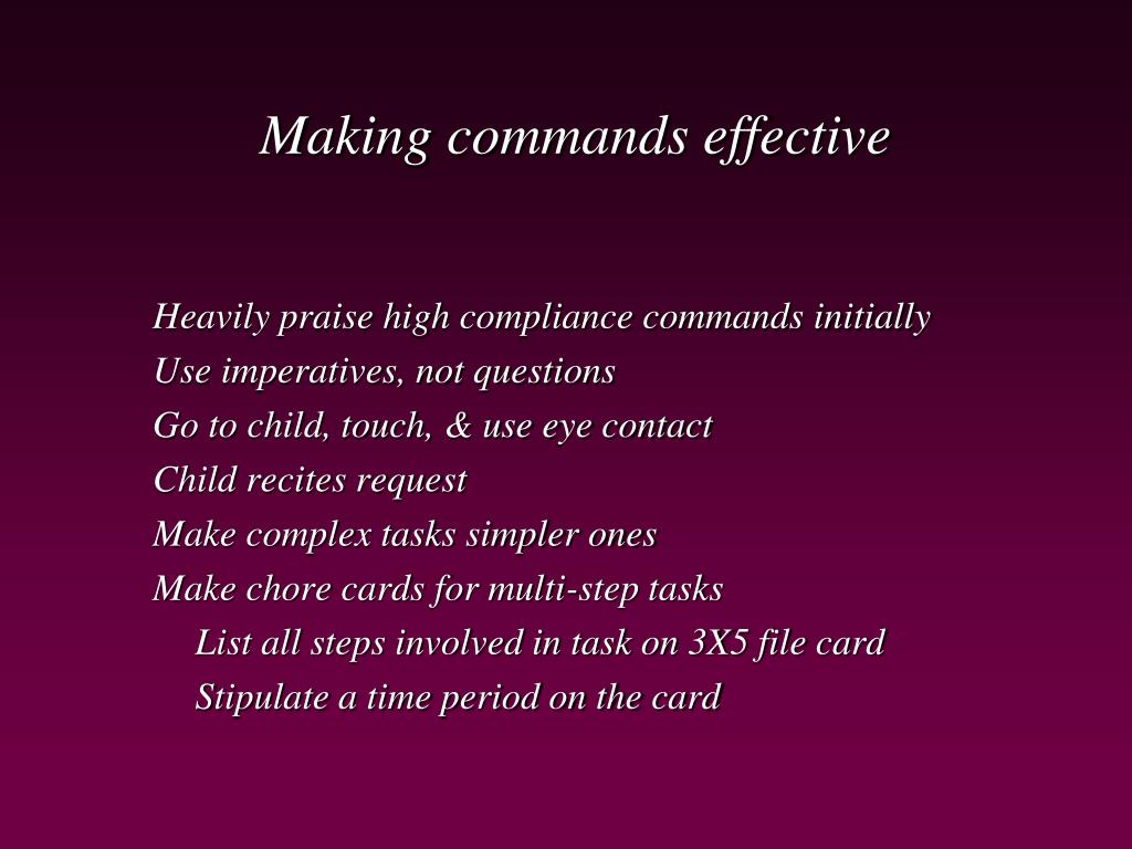 Making commands effective Heavily praise high compliance commands initially Use imperatives, not questions Go to child, touch, & use eye contact Child recites request Make complex tasks simpler ones Make chore cards for multi-step tasks List all steps involved in task on 3X5 file card Stipulate a time period on the card