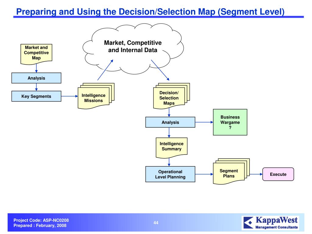 Preparing and Using the Decision/Selection Map (Segment Level) Market, Competitive and Internal Data Market and Competitive Map Analysis Intelligence Missions Decision/ Selection Maps Key Segments Business Wargame ? Analysis Intelligence Summary Segment Plans Operational Level Planning Execute 44