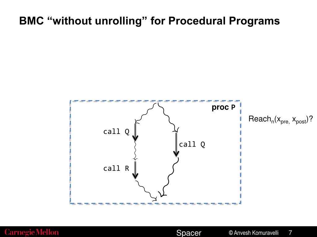 BMC “without unrolling” for Procedural Programs procP Reachn(xpre,xpost)? call Q call Q call R