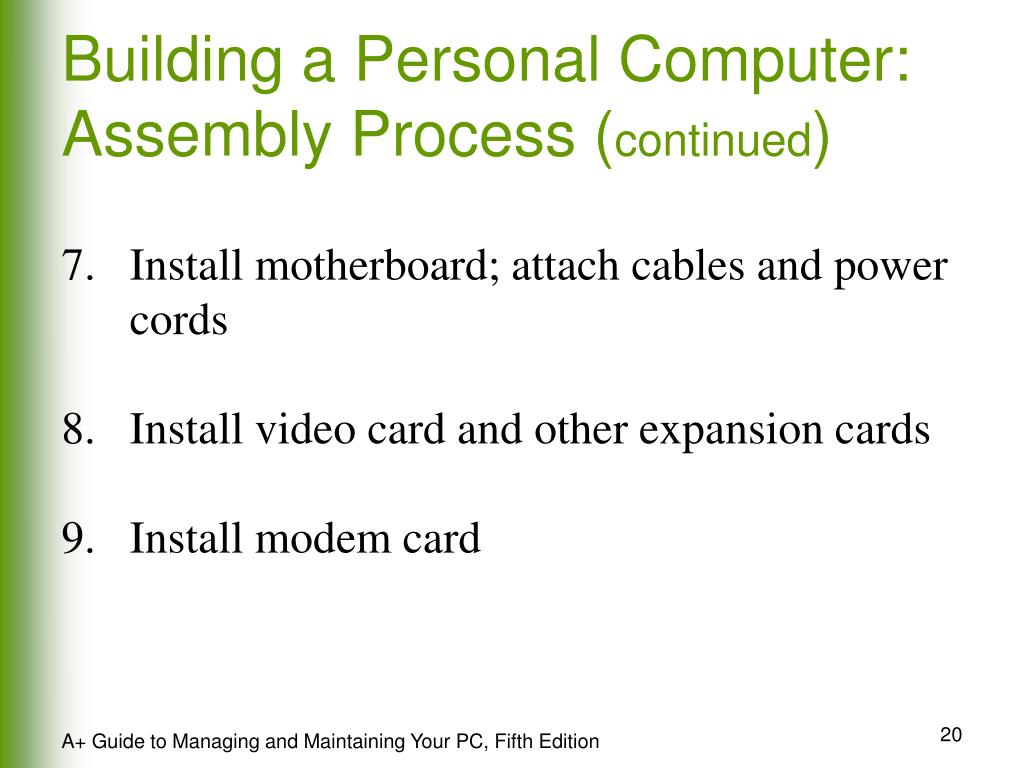 Building a Personal Computer: Assembly Process (continued) • Install motherboard; attach cables and power cords • Install video card and other expansion cards • Install modem card A+ Guide to Managing and Maintaining Your PC, Fifth Edition