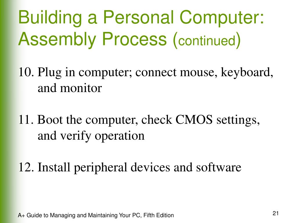 Building a Personal Computer: Assembly Process (continued) 10. Plug in computer; connect mouse, keyboard, and monitor 11. Boot the computer, check CMOS settings, and verify operation 12. Install peripheral devices and software A+ Guide to Managing and Maintaining Your PC, Fifth Edition