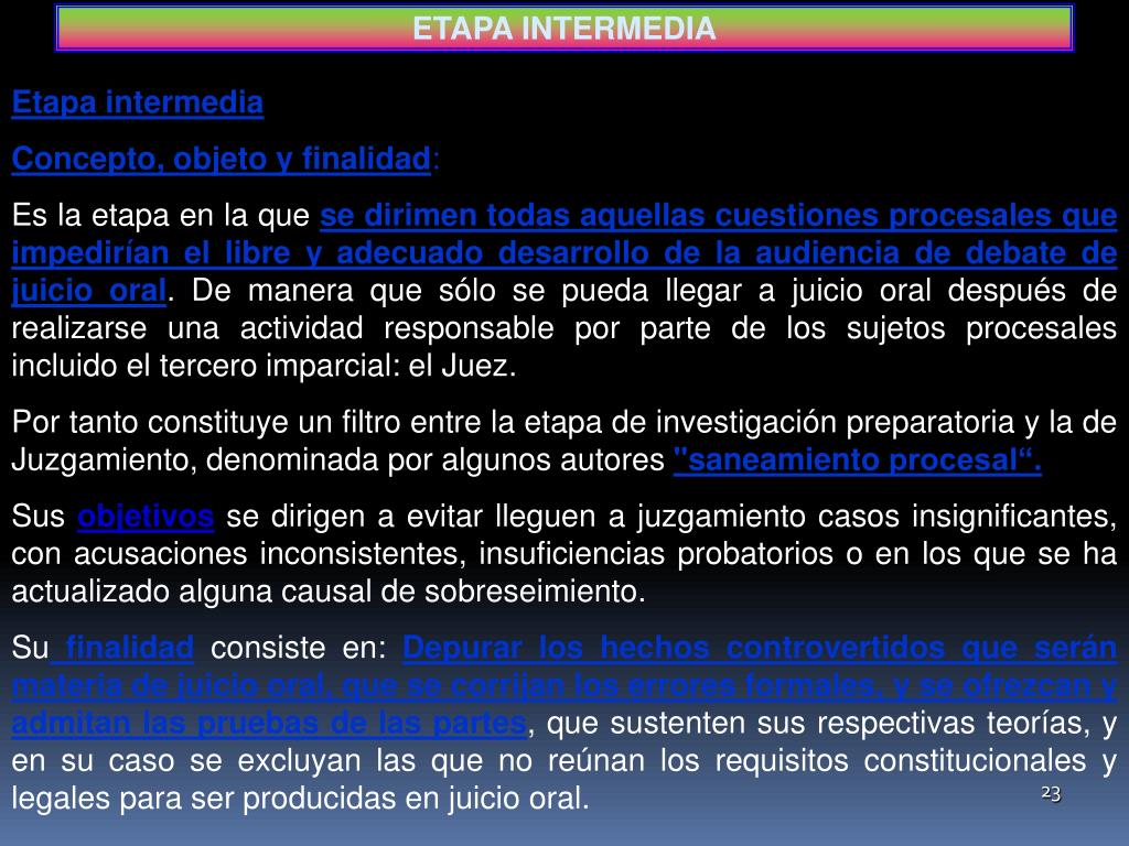 ETAPA INTERMEDIA Etapa intermedia Concepto, objeto y finalidad: Es la etapa en la que se dirimen todas aquellas cuestiones procesales que impedirían el libre y adecuado desarrollo de la audiencia de debate de juicio oral. De manera que sólo se pueda llegar a juicio oral después de realizarse una actividad responsable por parte de los sujetos procesales incluido el tercero imparcial: el Juez. Por tanto constituye un filtro entre la etapa de investigación preparatoria y la de Juzgamiento, denominada por algunos autores "saneamiento procesal“. Sus objetivosse dirigen a evitar lleguen a juzgamiento casos insignificantes, con acusaciones inconsistentes, insuficiencias probatorios o en los que se ha actualizado alguna causal de sobreseimiento. Su finalidadconsiste en: Depurar los hechos controvertidos que serán materia de juicio oral, que se corrijan los errores formales, y se ofrezcan y admitan las pruebas de las partes, que sustenten sus respectivas teorías, y en su caso se excluyan las que no reúnan los requisitos constitucionales y legales para ser producidas en juicio oral. 23