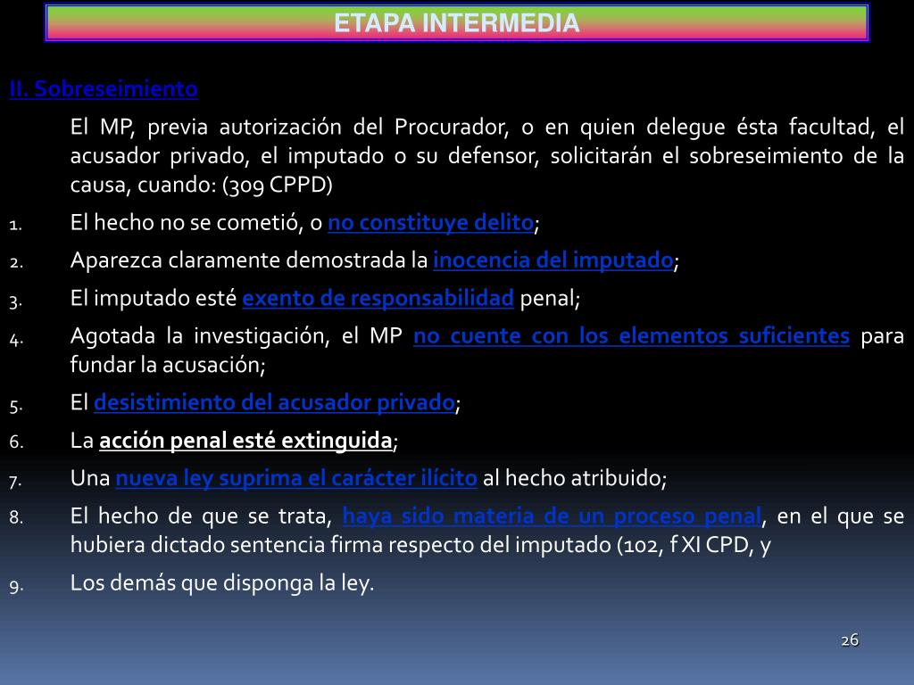 Efectos del cierre de la investigación (309 CPPD) Una vez decretado el cierre de la investigación, el MP dentro del plazo de diez días podrá: Solicitar la suspensión del proceso; Solicitar el sobreseimiento de la causa, o Formular la acusación. I. Procede la suspensión del proceso, y el juez la decretará: Por ausencia de un requisito de procedibilidad, o cuando se requiera de una resolución civil previa al juzgamiento penal; Se declare al imputado, formalmente sustraído de la acción de la justicia; El imputado sufra de un trastorno mental transitorio (313 CPPD). A solicitud de cualquiera de las partes, el juez podrá decretar la reapertura del proceso, cuando cese la causa que motivo la suspensión. ETAPA INTERMEDIA 25