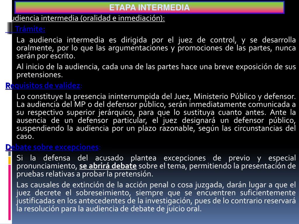 ETAPA INTERMEDIA Audiencia intermedia (oralidad e inmediación): Trámite: La audiencia intermedia es dirigida por el juez de control, y se desarrolla oralmente, por lo que las argumentaciones y promociones de las partes, nunca serán por escrito. Al inicio de la audiencia, cada una de las partes hace una breve exposición de sus pretensiones. Requisitos de validez: Lo constituye la presencia ininterrumpida del Juez, Ministerio Público y defensor. La audiencia del MP o del defensor público, serán inmediatamente comunicada a su respectivo superior jerárquico, para que lo sustituya cuanto antes. Ante la ausencia de un defensor particular, el juez designará un defensor público, suspendiendo la audiencia por un plazo razonable, según las circunstancias del caso. Debate sobre excepciones: Si la defensa del acusado plantea excepciones de previo y especial pronunciamiento, se abrirá debate sobre el tema, permitiendo la presentación de pruebas relativas a probar la pretensión. Las causales de extinción de la acción penal o cosa juzgada, darán lugar a que el juez decrete el sobreseimiento, siempre que se encuentren suficientemente justificadas en los antecedentes de la investigación, pues de lo contrario reservará la resolución para la audiencia de debate de juicio oral. .