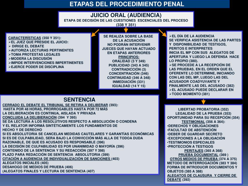ETAPAS DEL PROCEDIMIENTO PENAL JUICIO ORAL (AUDIENCIA) ETAPA DE DECISIÓN DE LAS CUESTIONES ESCENCIALES DEL PROCESO (338 Y 351) • EL DÍA DE LA AUDIENCIA • SE VERIFICA ASISTENCIA DE LAS PARTES • Y DISPONIBILIDAD DE TESTIGOS, • PERITOS E INTERPRETES • INICIA EL MP CON SUS ALEGATOS DE • APERTURA Y LUEGO LA DEFENSA HACE • LO PROPIO (380). • SE PROCEDE A LA RECEPCIÓN DE • LAS PRUEBAS, EN EL ORDEN QUE EL • OFERENTE LO DETERMINE, INICIANDO • CON LAS DEL MP, LUEGO LAS DEL • ACUSADOR COADYUVANTE Y • FINALMENTE LAS DEL ACUSADO (382) • EL ACUSADO PUEDE DECLARAR EN • TODO MOMENTO (381) • CARACTERÍSTICAS (350 Y 351): • EL JUEZ QUE PRESIDE EL JUICIO: • DIRIGE EL DEBATE • AUTORIZA LECTURAS PERTINENTES • TOMA PROTESTAS LEGALES • MODERA LA DISCUSIÓN • IMPIDE INTERVENCIONES IMPERTINENTES • EJERCE PODER DE DISCIPLINA SE REALIZA SOBRE LA BASE DE LA ACUSACIÓN NO PODRÁN INTERVENIR JUECES QUE HAYAN ACTUADO EN ETAPAS ANTERIORES PRINCIPIOS: ORALIDAD (3 Y 349) PUBLICIDAD (343 A 345) CONTRADICCIÓN (3) CONCENTRACIÓN (346) CONTINUIDAD (346 A 348) INMEDIACIÓN (331) IGUALDAD (14 Y 15) SENTENCIA CERRADO EL DEBATE EL TRIBUNAL SE RETIRA A DELIBERAR (393): HASTA POR 48 HORAS, PRORROGABLES HASTA POR 72 MÁS LA DELIBERACIÓN ES CONTINUA, AISLADA Y PRIVADA CONCLUIDA LA DELIBIERACIÓN (394 Y 395) SE DA LECTURA A LOS RESOLUTIVOS RESPECTO A ABSOLUCIÓN O CONDENA Y EL RELATOR INFORMÁ SINTÉTICAMENTE LOS FUNDAMENTOS DE HECHO Y DE DERECHO SI ES ABSOLUTORIA SE CANCELAN MEDIDAS CAUTELARES Y GARANTÍAS ECONÓMICAS SI ES DE CULPABILIDAD, SERA BAJO LA CONVICCIÓN MÁS ALLA DE TODOA DUDA RAZONABLE, DE QUE ES ACUSADO ES RESPONSABLE (396) LA DECISIÓN DE CULPABILIDAD ES POR UNANIMIDAD O MAYORÍA (396) CONTENIDO DE LA SENTENCIA Y SU REDACCIÓN (397 Y 398) PLAZO PARA REDACCIÓN DE SENTENCIA ABSOLUTORIA (399) CITACIÓN A AUDIENCIA DE INDIVIDUALIZACIÓN DE SANCIONES (403) ALEGATOS INICIALES (405) DESAHOGO DE MEDIOS DE PRUEBA (406) (ALEGATOS FINALES Y LECTURA DE SENTENCIA (407) • LIBERTAD PROBATORIA (352) • LEGALIDAD DE LA PRUEBA (353) • OPORTUNIDAD PARA SU RECEPCIÓN (354) • TESTIMONIAL (356 A 364): • DERECHOS Y OBLIGACIONES • FACULTAD DE ABSTENCIÓN • DEBER DE GUARDAR SECRETO • EXCEPCIONES A LA OBLIGACIÓN • TESTIMONIOS ESPECIALES • PROTECCIÓN A TESTIGOS • PERITAJES (365 A 368) • PRUEBA DOCUMENTAL (369 ) • OTROS MEDIOS DE PRUEBA (374 A 375) • METODO DE INTERROGACIÓN (383 Y 384) • FORMA DE INTRODUCIR DOCUMENTOS Y • OBJETOS (385 A 388) • ALEGATOS DE CLAUSURA Y CIERRE DE • DEBATE (392)
