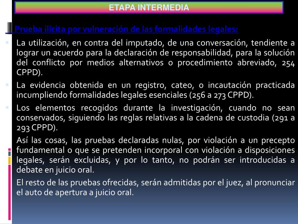 ETAPA INTERMEDIA Prueba ilícita por vulneración de las formalidades legales: • La utilización, en contra del imputado, de una conversación, tendiente a lograr un acuerdo para la declaración de responsabilidad, para la solución del conflicto por medios alternativos o procedimiento abreviado, 254 CPPD). • La evidencia obtenida en un registro, cateo, o incautación practicada incumpliendo formalidades legales esenciales (256 a 273 CPPD). • Los elementos recogidos durante la investigación, cuando no sean conservados, siguiendo las reglas relativas a la cadena de custodia (291 a 293 CPPD). Así las cosas, las pruebas declaradas nulas, por violación a un precepto fundamental o que se pretenden incorporal con violación a disposiciones legales, serán excluidas, y por lo tanto, no podrán ser introducidas a debate en juicio oral. El resto de las pruebas ofrecidas, serán admitidas por el juez, al pronunciar el auto de apertura a juicio oral.