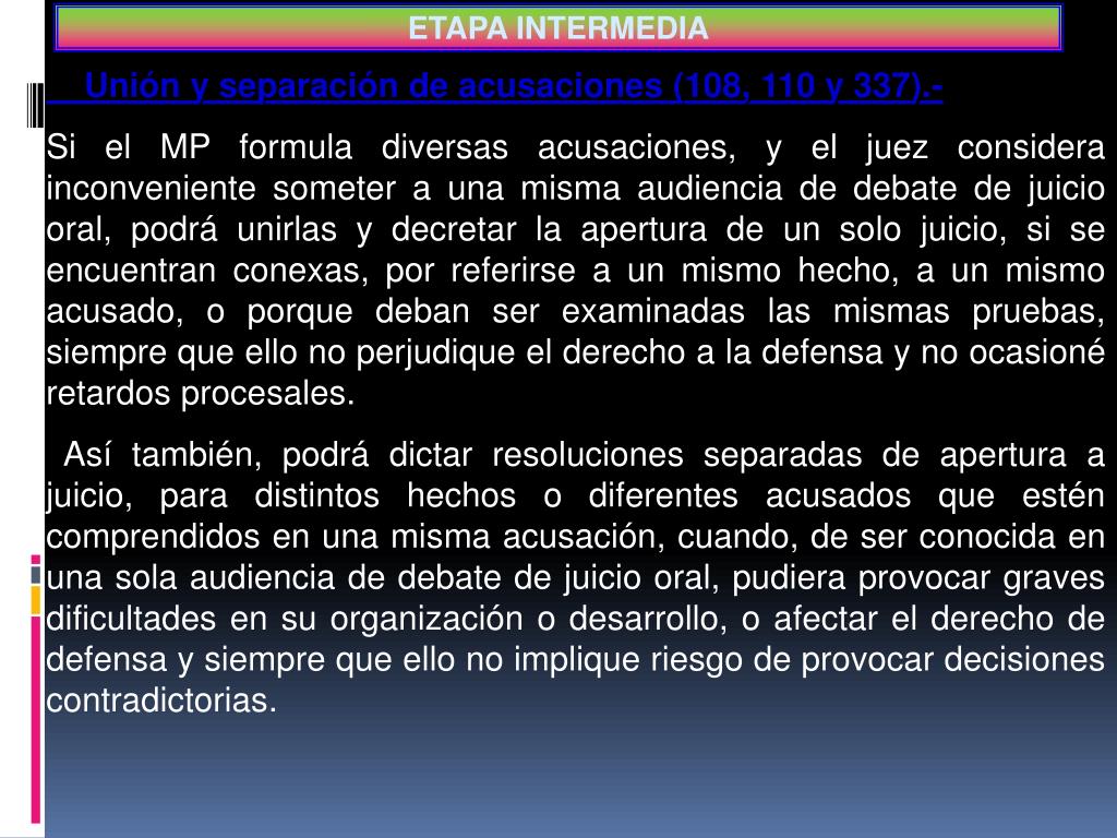 ETAPA INTERMEDIA Unión y separación de acusaciones (108, 110 y 337).- Si el MP formula diversas acusaciones, y el juez considera inconveniente someter a una misma audiencia de debate de juicio oral, podrá unirlas y decretar la apertura de un solo juicio, si se encuentran conexas, por referirse a un mismo hecho, a un mismo acusado, o porque deban ser examinadas las mismas pruebas, siempre que ello no perjudique el derecho a la defensa y no ocasioné retardos procesales. Así también, podrá dictar resoluciones separadas de apertura a juicio, para distintos hechos o diferentes acusados que estén comprendidos en una misma acusación, cuando, de ser conocida en una sola audiencia de debate de juicio oral, pudiera provocar graves dificultades en su organización o desarrollo, o afectar el derecho de defensa y siempre que ello no implique riesgo de provocar decisiones contradictorias.