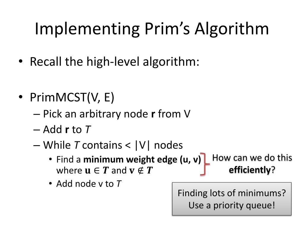 Implementing Prim’s Algorithm • Recall the high-level algorithm: • PrimMCST(V, E) • Pick an arbitrary node r from V • Add r to T • While T contains < |V| nodes • Find a minimum weight edge (u, v)where and • Add node v to T How can we do this efficiently? Finding lots of minimums?Use a priority queue!