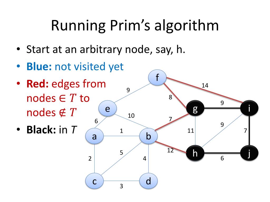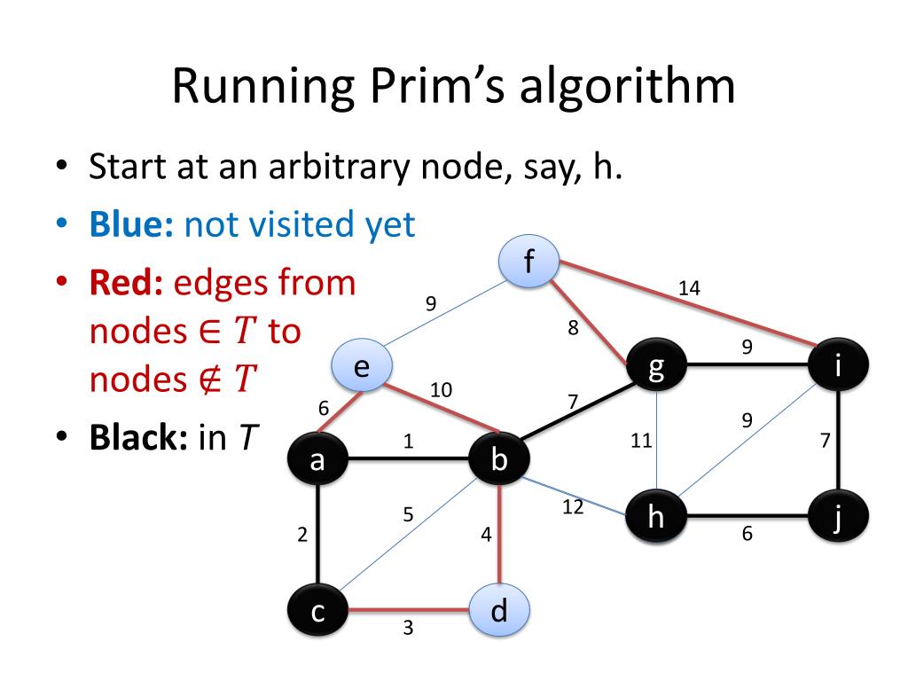 Running Prim’s algorithm • Start at an arbitrary node, say, h. • Blue: not visited yet • Red: edges fromnodes tonodes • Black: in T f 14 9 8 9 g i e 10 7 6 9 11 7 1 a b 12 h h j 5 6 2 4 c d 3
