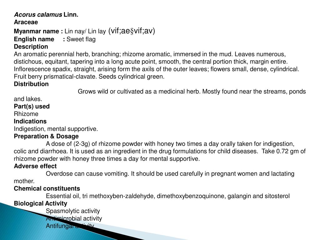 Acorus calamusLinn. Araceae Myanmar name : Lin nay/ Lin lay (vif;ae§vif;av) English name : Sweet flag Description An aromatic perennial herb, branching; rhizome aromatic, immersed in the mud. Leaves numerous, distichous, equitant, tapering into a long acute point, smooth, the central portion thick, margin entire. Inflorescence spadix, straight, arising form the axils of the outer leaves; flowers small, dense, cylindrical. Fruit berry prismatical-clavate. Seeds cylindrical green. Distribution Grows wild or cultivated as a medicinal herb. Mostly found near the streams, ponds and lakes. Part(s) used Rhizome Indications Indigestion, mental supportive. Preparation & Dosage A dose of (2-3g) of rhizome powder with honey two times a day orally taken for indigestion, colic and diarrhoea. It is used as an ingredient in the drug formulations for child diseases. Take 0.72 gm of rhizome powder with honey three times a day for mental supportive. Adverse effect Overdose can cause vomiting. It should be used carefully in pregnant women and lactating mother. Chemical constituents Essential oil, tri methoxyben-zaldehyde, dimethoxybenzoquinone, galangin and sitosterol Biological Activity Spasmolytic activity Antimicrobial activity Antifungal activity