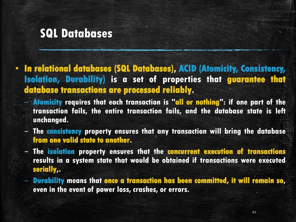 SQL Databases • In relational databases (SQL Databases), ACID (Atomicity, Consistency, Isolation, Durability) is a set of properties that guarantee that database transactions are processed reliably. • Atomicityrequires that each transaction is "all or nothing": if one part of the transaction fails, the entire transaction fails, and the database state is left unchanged. • The consistency property ensures that any transaction will bring the database from one valid state to another. • The isolation property ensures that the concurrent execution of transactions results in a system state that would be obtained if transactions were executed serially,. • Durabilitymeans that once a transaction has been committed, it will remain so, even in the event of power loss, crashes, or errors.