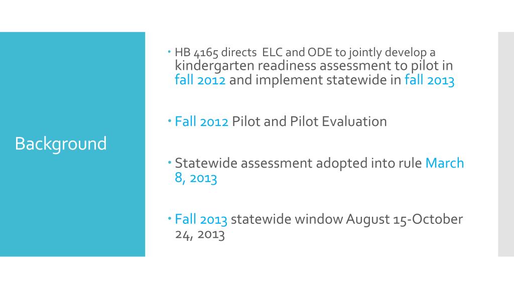 HB 4165 directs ELC and ODE to jointly develop a kindergarten readiness assessment to pilot in fall 2012and implement statewide in fall 2013 • Fall 2012 Pilot and Pilot Evaluation • Statewide assessment adopted into rule March 8, 2013 • Fall 2013 statewide window August 15-October 24, 2013 Background