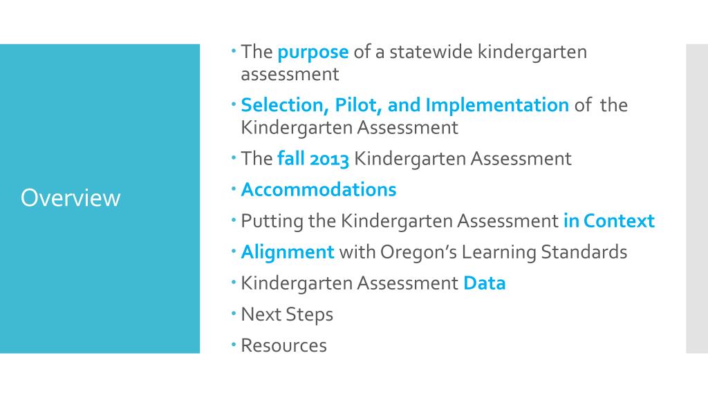 The purpose of a statewide kindergarten assessment • Selection, Pilot, and Implementation of the Kindergarten Assessment • The fall 2013 Kindergarten Assessment • Accommodations • Putting the Kindergarten Assessment in Context • Alignment with Oregon’s Learning Standards • Kindergarten Assessment Data • Next Steps • Resources Overview