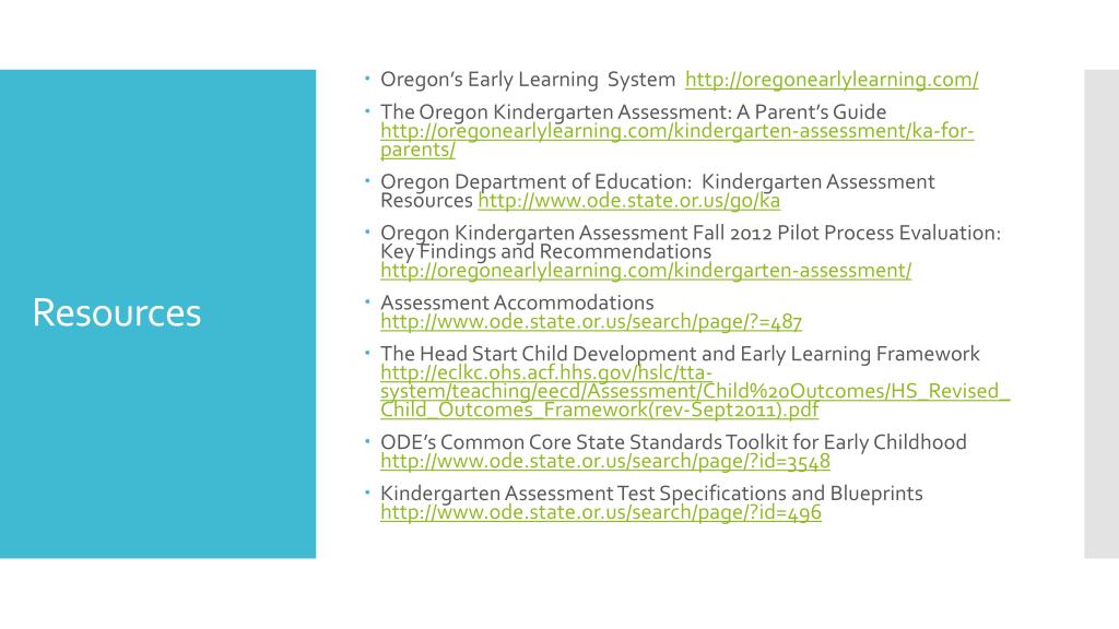 Oregon’s Early Learning System http://oregonearlylearning.com/ • The Oregon Kindergarten Assessment: A Parent’s Guide http://oregonearlylearning.com/kindergarten-assessment/ka-for-parents/ • Oregon Department of Education: Kindergarten Assessment Resources http://www.ode.state.or.us/go/ka • Oregon Kindergarten Assessment Fall 2012 Pilot Process Evaluation: Key Findings and Recommendations http://oregonearlylearning.com/kindergarten-assessment/ • Assessment Accommodations http://www.ode.state.or.us/search/page/?=487 • The Head Start Child Development and Early Learning Framework http://eclkc.ohs.acf.hhs.gov/hslc/tta-system/teaching/eecd/Assessment/Child%20Outcomes/HS_Revised_Child_Outcomes_Framework(rev-Sept2011).pdf • ODE’s Common Core State Standards Toolkit for Early Childhood http://www.ode.state.or.us/search/page/?id=3548 • Kindergarten Assessment Test Specifications and Blueprints http://www.ode.state.or.us/search/page/?id=496 Resources
