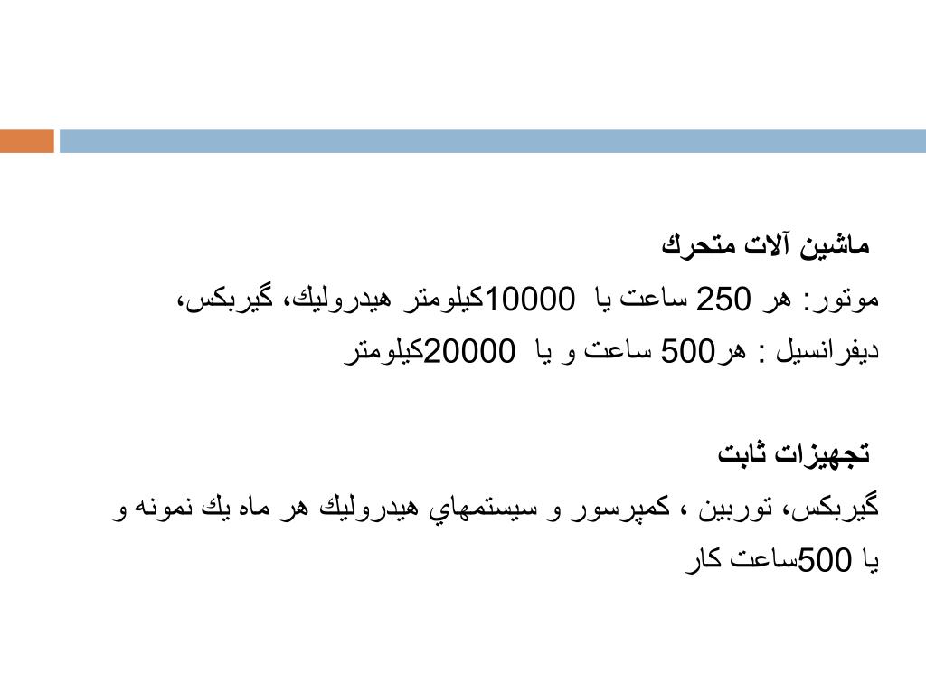 ماشين آلات متحركموتور: هر 250 ساعت يا 10000كيلومتر هيدروليك، گيربكس، ديفرانسيل : هر500 ساعت و یا 20000كيلومتر تجهيزات ثابتگيربكس، توربين ، كمپرسور و سيستمهاي هيدروليك هر ماه يك نمونه و يا 500ساعت كار