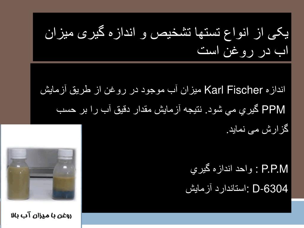یکی از انواع تستها تشخیص و اندازه گیری میزان اب در روغن است ميزان آب موجود در روغن از طريق آزمايش Karl Fischer اندازه گيري مي شود. نتیجه آزمايش مقدار دقيق آب را بر حسب PPM گزارش می نماید. واحد اندازه گيري: P.P.Mاستاندارد آزمایش: D-6304
