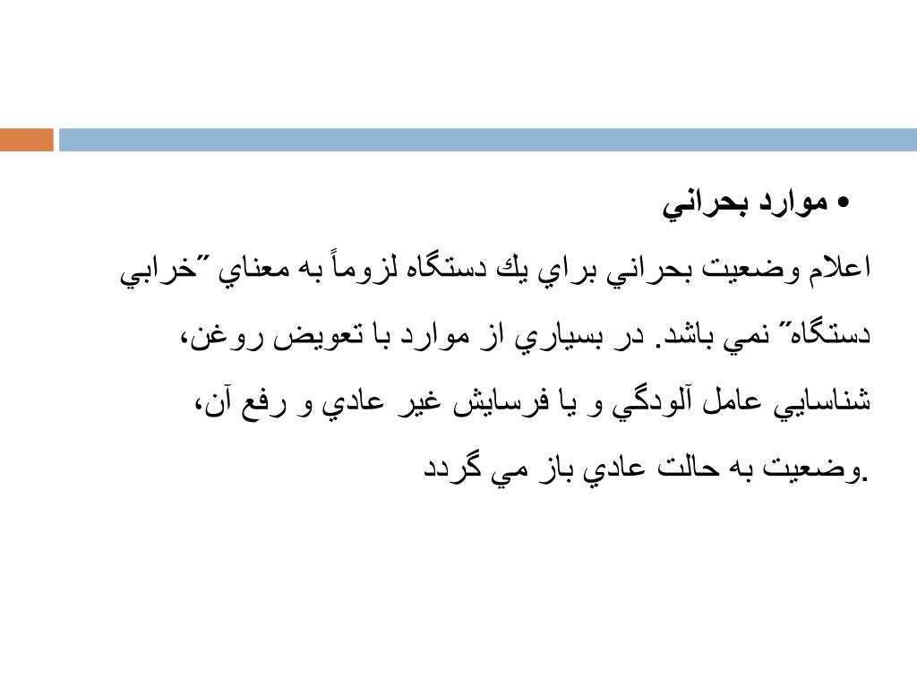 • موارد بحرانياعلام وضعيت بحراني براي يك دستگاه لزوماً به معناي ˝خرابي دستگاه˝ نمي باشد. در بسياري از موارد با تعويض روغن، شناسايي عامل آلودگي و يا فرسايش غير عادي و رفع آن، وضعيت به حالت عادي باز مي گردد.