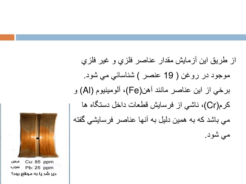 از طريق اين آزمايش مقدار عناصر فلزي و غير فلزي موجود در روغن ( 19 عنصر ) شناسائي مي شود. برخي از اين عناصر مانند آهن(Fe)، آلومينيوم (Al) و كرم(Cr)، ناشي از فرسايش قطعات داخل دستگاه ها مي باشد كه به همين دليل به آنها عناصر فرسايشي گفته مي شود.