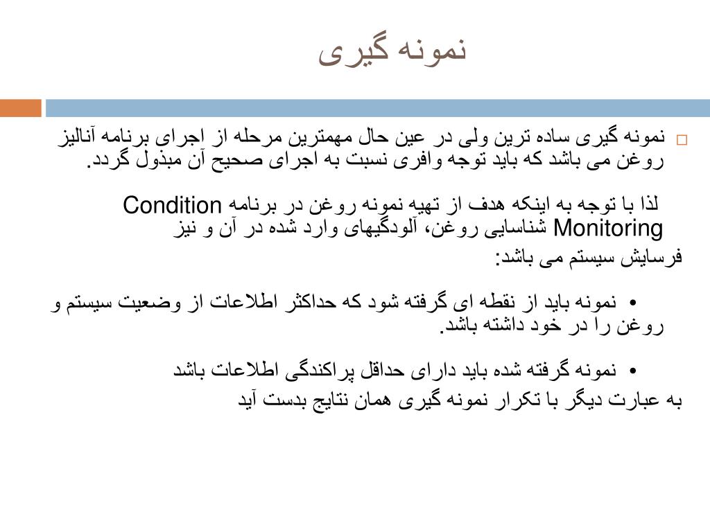 نمونه گیری • نمونه گیری ساده ترین ولی در عین حال مهمترین مرحله از اجرای برنامه آنالیز روغن می باشد که باید توجه وافری نسبت به اجرای صحیح آن مبذول گردد. لذا با توجه به اینکه هدف از تهیه نمونه روغن در برنامه Condition Monitoring شناسایی روغن، آلودگیهای وارد شده در آن و نیز فرسایش سیستم می باشد: • نمونه باید از نقطه ای گرفته شود که حداکثر اطلاعات از وضعیت سیستم و روغن را در خود داشته باشد. • نمونه گرفته شده باید دارای حداقل پراکندگی اطلاعات باشد به عبارت دیگر با تکرار نمونه گیری همان نتایج بدست آید