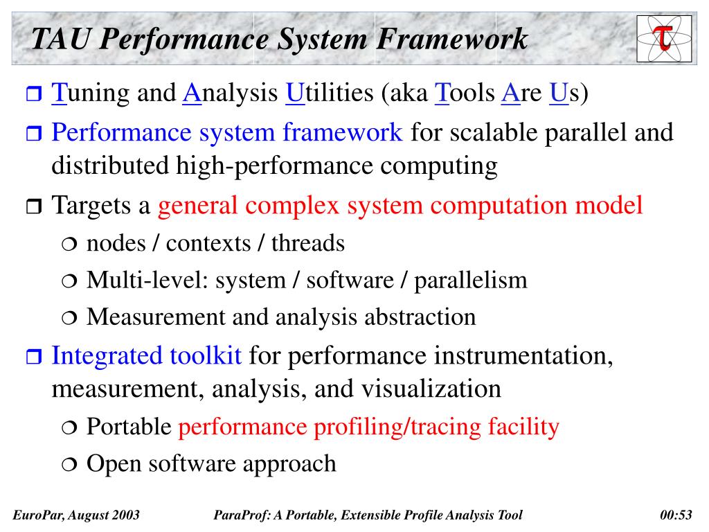 TAU Performance System Framework • Tuning and Analysis Utilities (aka Tools Are Us) • Performance system framework for scalable parallel and distributed high-performance computing • Targets a general complex system computation model • nodes / contexts / threads • Multi-level: system / software / parallelism • Measurement and analysis abstraction • Integrated toolkit for performance instrumentation, measurement, analysis, and visualization • Portable performance profiling/tracing facility • Open software approach