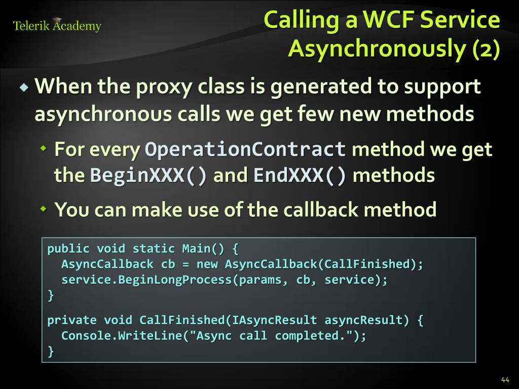 Calling a WCF Service Asynchronously (2) • When the proxy class is generated to support asynchronous calls we get few new methods • For every OperationContract method we get the BeginXXX() and EndXXX() methods • You can make use of the callback method public void static Main() { AsyncCallback cb = new AsyncCallback(CallFinished); service.BeginLongProcess(params, cb, service); } private void CallFinished(IAsyncResult asyncResult) { Console.WriteLine("Async call completed."); }
