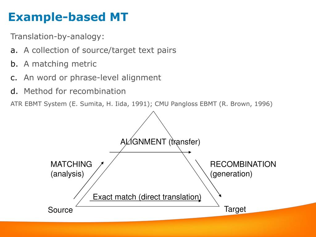 ALIGNMENT (transfer) MATCHING (analysis) RECOMBINATION (generation) Exact match (direct translation) Target Source Example-based MT • Translation-by-analogy: • A collection of source/target text pairs • A matching metric • An word or phrase-level alignment • Method for recombination • ATR EBMT System (E. Sumita, H. Iida, 1991); CMU Pangloss EBMT (R. Brown, 1996)