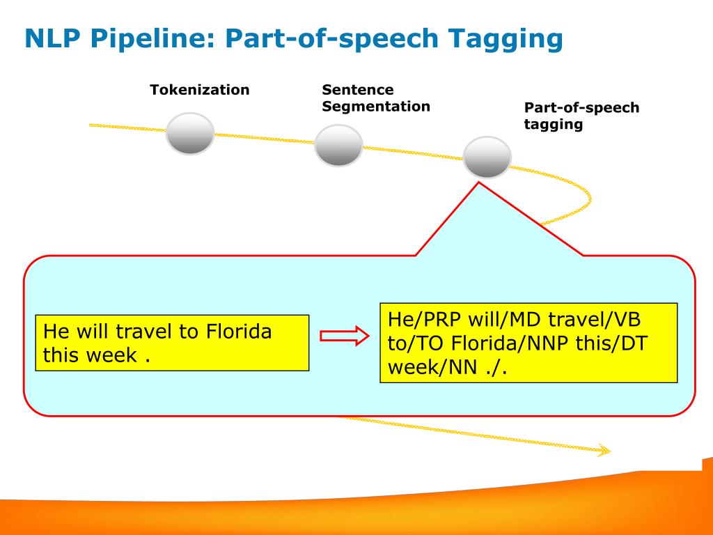 Noun/Verb Chunking Named Entity Detection Syntactic Parsing Word Sense Disambiguation Co-reference resolution Semantic Role Labeling NLP Pipeline: Part-of-speech Tagging Tokenization Sentence Segmentation Part-of-speech tagging He/PRP will/MD travel/VB to/TO Florida/NNP this/DT week/NN ./. He will travel to Florida this week .