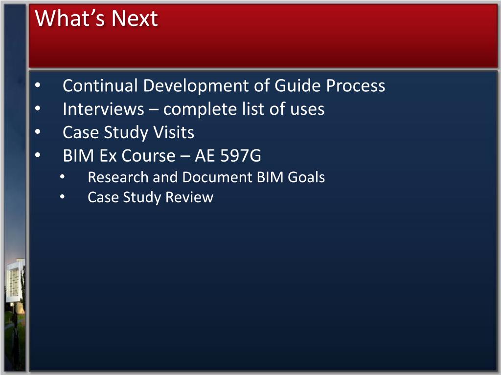 What’s Next • Continual Development of Guide Process • Interviews – complete list of uses • Case Study Visits • BIM Ex Course – AE 597G • Research and Document BIM Goals • Case Study Review