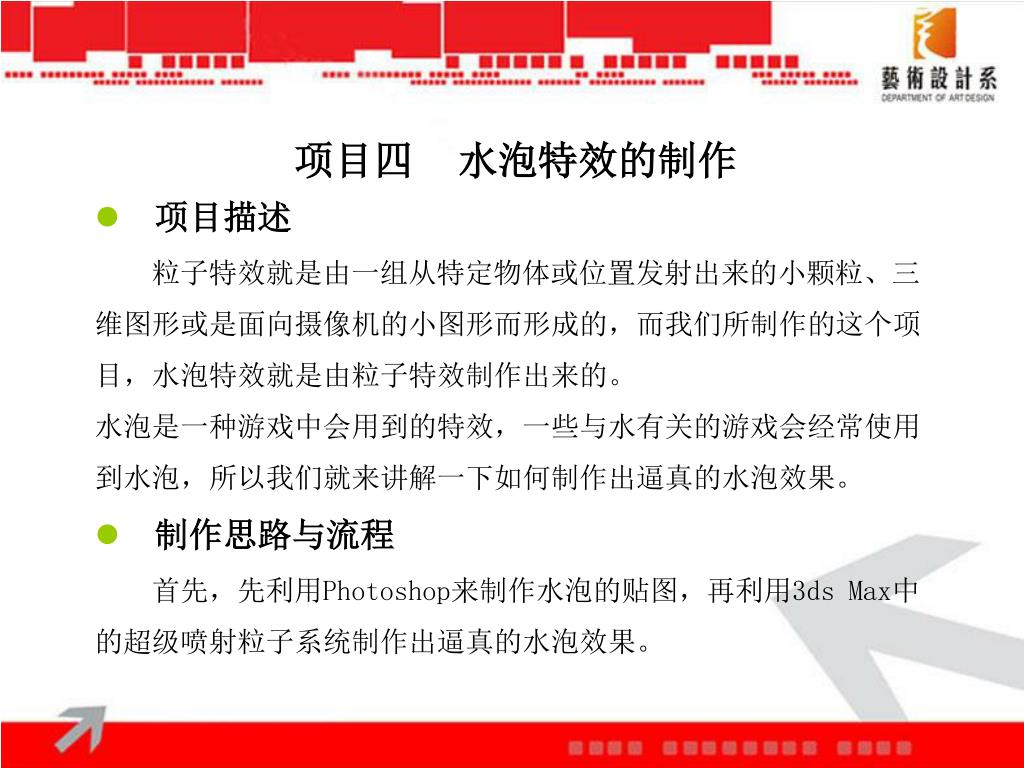 项目四 水泡特效的制作 • 项目描述 • 粒子特效就是由一组从特定物体或位置发射出来的小颗粒、三维图形或是面向摄像机的小图形而形成的,而我们所制作的这个项目,水泡特效就是由粒子特效制作出来的。 • 水泡是一种游戏中会用到的特效,一些与水有关的游戏会经常使用到水泡,所以我们就来讲解一下如何制作出逼真的水泡效果。 • 制作思路与流程 • 首先,先利用Photoshop来制作水泡的贴图,再利用3ds Max中的超级喷射粒子系统制作出逼真的水泡效果。